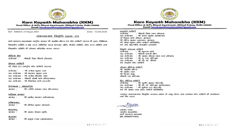 नई दिल्ली। विगत 12 अप्रैल को कर्ण कायस्थ महासभा (KKM) ने अपने द्विवर्षीय संगठनात्मक नियुक्ति के दूसरे चरण की घोषणा की। इन संगठनात्मक नियुक्ति की जानकारी देते हुये KKM के राष्ट्रीय अध्यक्ष श्री आशीष नीरज और राष्ट्रीय महासचिव श्री आनंद दास जी ने बताया की ये सभी नियुक्ति तत्काल प्रभाव से लागू होंगें और वर्तमान कोर कमिटी के कार्यकाल तक वैद्य रहेंगे।