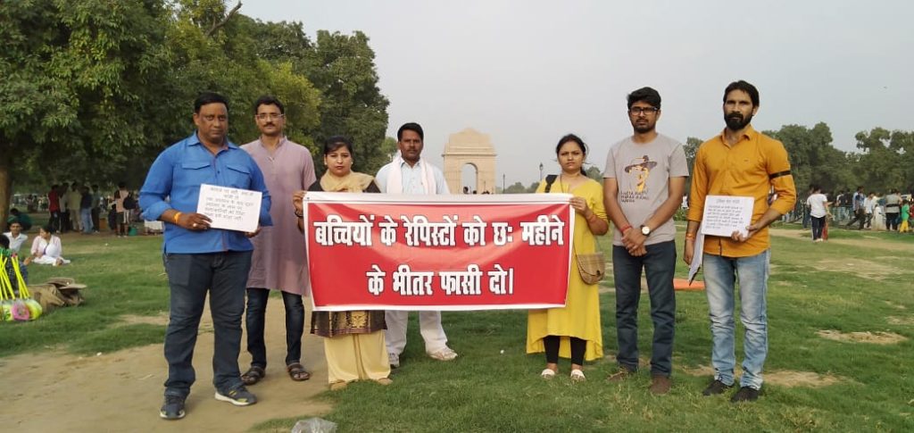 नई दिल्ली। इंडिया गेट पर बच्चियों के बलात्कारियों पर त्वरित कार्रवाई और फांसी की सजा होने पर 6 महीने के भीतर या जल्द से जल्द फांसी दिए जाने की मांग को लेकर वरिष्ठ पत्रकार एवं साहित्यकार और समाजसेवियों द्वारा एक स्वतरू स्फूर्त प्रदर्शन कार्यक्रम आयोजित किया गया।