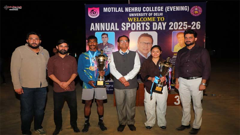 नई दिल्ली। मोतीलाल नेहरू कॉलेज (सांध्य) ने अपनी वार्षिक खेलकूद प्रतियोगिता 2025–26 का सफलतापूर्वक आयोजन किया। तीन दिवसीय आयोजन में शानदार प्रदर्शन करते हुए मानस कुमार (बी.ए. प्रोग्राम, प्रथम वर्ष) ने तीन प्रतियोगिताओं में प्रथम स्थान प्राप्त कर सर्वश्रेष्ठ एथलीट (पुरुष) का खिताब जीता। वहीं आहना बराल (बी.ए. प्रोग्राम, प्रथम वर्ष) ने चार प्रतियोगिताओं में प्रथम तथा एक में द्वितीय स्थान प्राप्त कर सर्वश्रेष्ठ एथलीट (महिला) का खिताब अपने नाम किया।