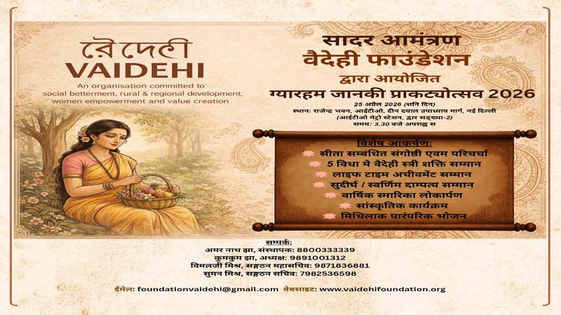 नई दिल्ली। जानकी नवमी के अवसर पर वैदेही फाउंडेशन का ग्यारहवां वार्षिक आयोजन ‘ग्यारहम जानकी प्राकट्योत्सव 2026’ इस वर्ष भी वैशाख शुक्ल नवमी तदनुसार 25 अप्रैल को दिन शनिवार को राजेन्द्र भवन सभागार, आईटीओ, दीन दयाल उपाध्याय मार्ग, नई दिल्ली में मनाया जाएगा।