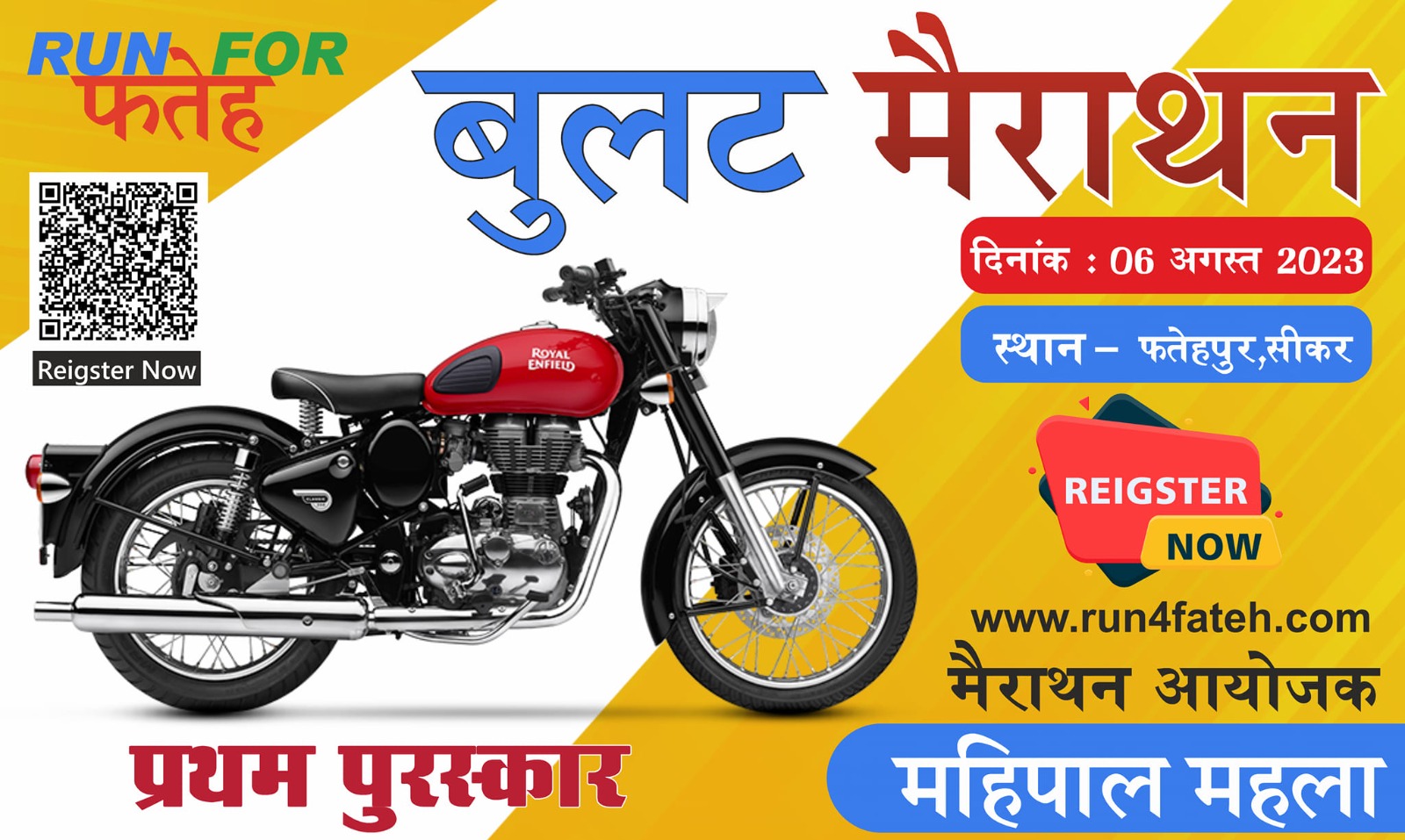 नई दिल्ली।  कभी किसी ने सपने में भी नहीं सोचा होगा कि केवल तेज भागने से ही Royal Enfield की बुलट मिल सकती है। लेकिन यह खबर एकदम सही है आज हम बात कर रहे हैं राजस्थान के सीकर जिले के अन्तर्गत आने वाली फतेहपुर विधानसभा सीट की जहां से आगामी विधानसभा चुनाव लड़ने वाले महिपाल महला ने प्रेस कांफ्रेंस करके बुलट मैराथन की घोषणा करके सबको चौका दिया है। महिपाल महला ने प्रेस कांफ्रेंस करते हुए बताया कि 06 अगस्त को फतेहपुर सीकर में बुलट मैराथन का आयोजन किया जाएगा जो करीब 2500 मीटर की होगी और इसमें प्रथम विजेता को Royal Enfield classic 350 बुलट दिया जाएगा । जिसमें द्वितीय स्थान प्राप्त करने वाले को लेपटॉप एवं तीसरा स्थान प्राप्त करने वाले को Smart tv दिया जाएगा। साथ ही सभी प्रतिभागियों को एक-एक पौधे देने के साथ ही एक ही दिन में ग्यारह हजार पौधे लगाने का लक्ष्य रखा हैं। वहीं इस बुलट मैराथन में केवल राजस्थान के लोग ही भाग लें सकते हैं। इसके लिए www.run4fateh.com नामक वेबसाइट पर रजिस्ट्रेशन करवाना अनिवार्य होगा।