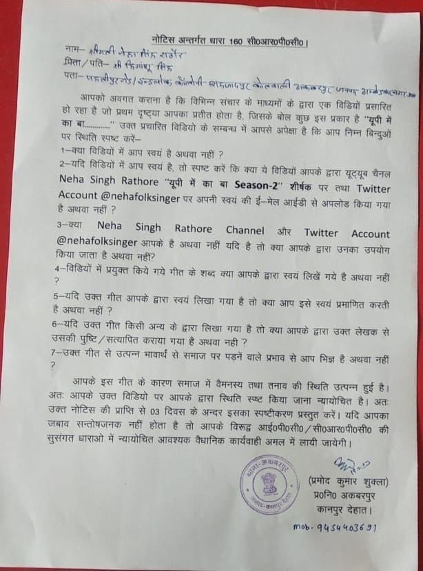 नई दिल्ली। उत्तर प्रदेश में विधानसभा चुनाव से पहले ‘यूपी में का बा…’ गीत गाकर सुर्खियां बटोरने वाली बिहार की नेहा सिंह राठौर को कानपुर जिले की अकबरपुर कोतवाली पुलिस ने दिया है। उत्तर प्रदेश पुलिस ने नेहा सिंह राठौर को 160 सीआरपीसी का यह नोटिस मंगलवार रात दिल्ली स्थित घर पर सौंपा। इसका जवाब न देने पर नेहा पर कानूनी शिकंजा कस सकता है।