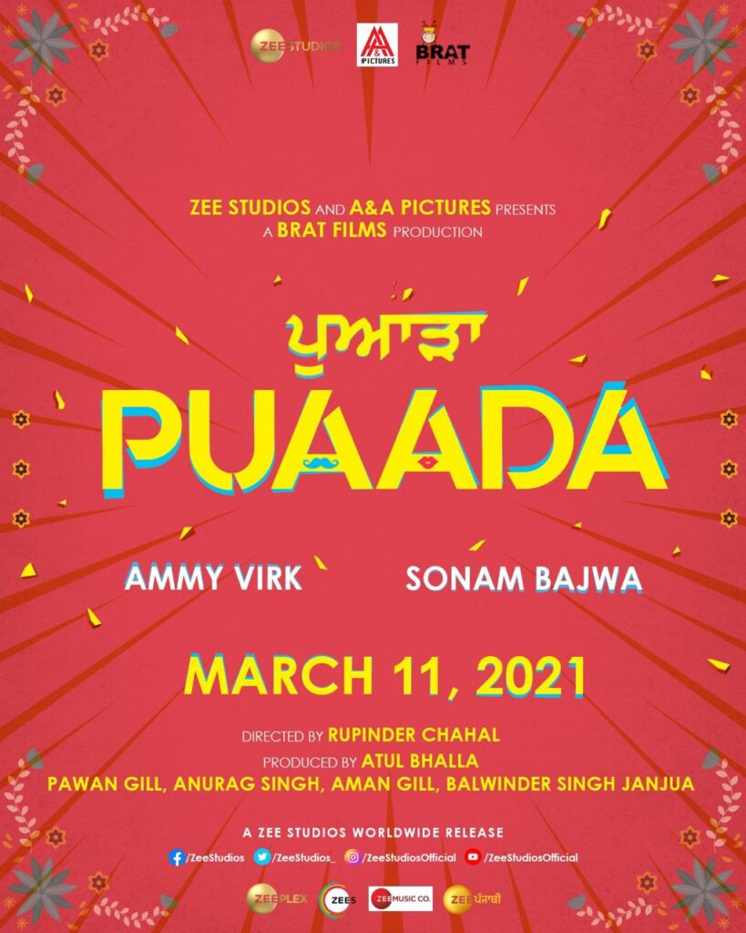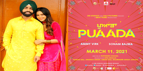 पुआडा अम्मी विर्क और सोनम बाजवा द्वारा अभिनीत, एएंडए पिक्चर्स और ब्रैट फिल्म्स द्वारा निर्मित, रूपिंदर चहल द्वारा निर्देशित, अतुल भल्ला द्वारा निर्मित, पवन गिल, अनुराग सिंह, अमन गिल, बलविंदर सिंह राजुआ, 11 मार्च, 2021 को दुनिया भर में ज़ी स्टूडियो द्वारा रिलीज़ होगी। ।