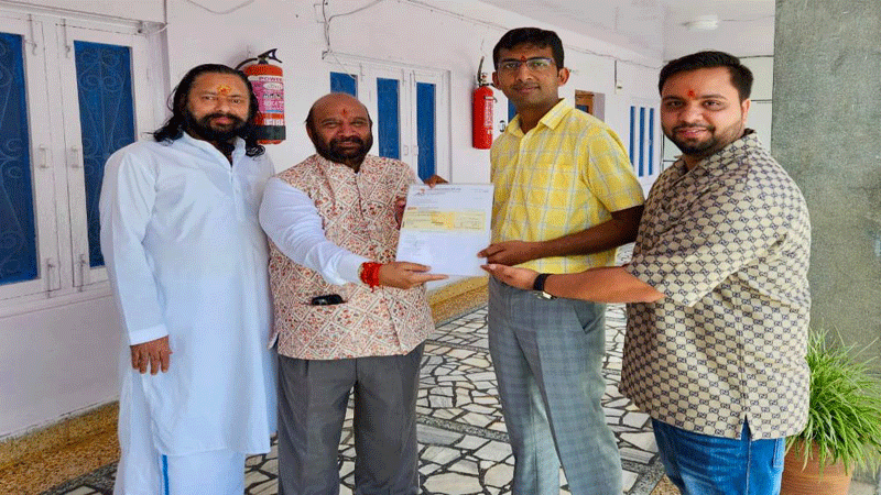 डॉक्टर महिन्द्र शर्मा ने आज यह राशि श्री माता वैष्णो देवी श्राइन बोर्ड के मुख्य कार्यकारी अधिकारी श्री अंशुल गर्ग को कटरा में आज एक करोड़ एक लाख रुपए का पंजाब नेशनल बैंक ड्राफ्ट भेंट करके दी। इस अवसर अबसर पर उनका बेटा ध्रुव शर्मा भी उनके साथ था।