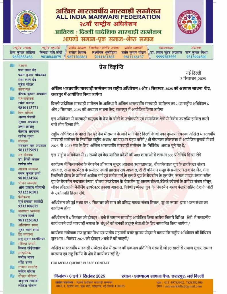 नई दिल्ली। दिल्ली प्रादेशिक मारवाड़ी सम्मेलन के आतिथ्य में अखिल भारतवर्षीय मारवाड़ी सम्मेलन का 28वां राष्ट्रीय अधिवेशन आगामी 6 और 7 सितंबर, 2025 को अध्यात्म साधना केंद्र, छतरपुर (नई दिल्ली) में भव्य रूप से आयोजित किया जाएगा। इस दो दिवसीय अधिवेशन में देशभर से 25 राज्यों और केंद्र शासित प्रदेशों की लगभग 400 शाखाओं के 600 से अधिक प्रतिनिधि भाग लेंगे। कार्यक्रम में देश के प्रमुख उद्योगपति, समाजसेवी और मारवाड़ी समाज की प्रतिष्ठित हस्तियाँ शिरकत करेंगी।
