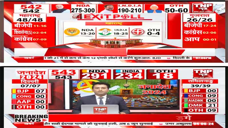 नई दिल्ली। एक तरफ जहां मीडिया की विश्वसनीयता पर इस बार के लोकसभा चुनाव में प्रश्न चिन्ह लग गया है वैसे में राष्ट्रीय स्तर पर अपनी बड़ी पहचान बन चुके टीएनपी न्यूज़ समूह ने अपने सटीक ईमानदार भरोसेमंद एग्जिट पोल के दम पर एक नई पहचान कायम की है। देश के कई प्रमुख मीडिया संस्थानों ने भी चैनल के इस स्टीक के एग्जिट पोल की सराहना की है।देश के तमाम टेलीविजन चैनलों ने जहां एग्जिट पोल में एनडीए गठबंधन को 300 प्लस सीट दिखाई थी वही देश के गांव-गांव तक अपने नेटवर्क को मजबूत कर चुके देश के सबसे बड़े मीडिया समूह टीएनपी न्यूज़ ने अपने चुनावी सर्वे में सबसे सटीक एग्जिट पोल दिखाया था चैनल ने अपने एग्जिट पोल में एनडीए को 275 से 300 सीट इंडिया गठबंधन को 190 से 210 सीट तथा अन्य को 50 से 60 सीट दिखाई थी। जो अंततः चुनाव परिणाम आने के बाद सटीक साबित हुआ।