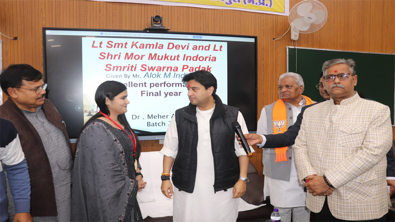 शिवपुरी। शिवपुरी मेडिकल कॉलेज की एमबीबीएस प्रथम बैच की पासआउट छात्रा सुश्री मेहर को एमबीबीएस की परीक्षा में यूनिवर्सिटी टॉप करने तथा छात्राओं में सर्वाधिक अंक प्राप्त करने के उपलक्ष्य पर उन्हें श्रीमती कमला देवी मेमोरियल गोल्ड मेडल केन्द्रीय मंत्री एवं क्षेत्र के लाडले सांसद श्रीमंत ज्योतिरादित्य सिंधिया के करकमलों से कल श्रीमंत राजमाता विजया राजे सिंधिया चिकित्सा महाविद्यालय अस्पताल के सभागार में प्रदान किया गया।