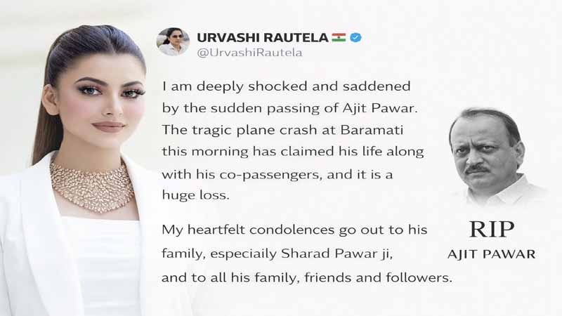 एक्स पर उर्वशी रौतेला ने लिखा: “अजित पवार के अचानक निधन से मैं बेहद स्तब्ध और दुखी हूं। आज सुबह बारामती में हुए इस दुखद विमान हादसे ने उनकी जान ले ली और एक बड़ा शून्य छोड़ दिया है। उनके परिवार, प्रियजनों और इस अपूरणीय क्षति से प्रभावित सभी लोगों के प्रति मेरी हार्दिक संवेदनाएं।”